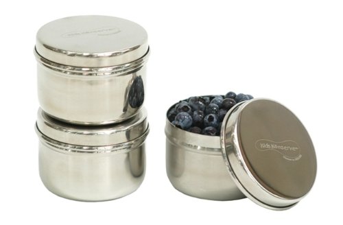 This perfect size fits more than you'd think! Ideal for nuts, berries, goldfish, baby carrots, stacked small cookies, hummus and more. Great alternative to snack sized plastic baggies when you are on the run. Also great for taking vitamins to work or while traveling. BPA, Lead & Phthalate Free! * Hand wash warm soapy water recommended. * Should you experience the appearance of "rust" on any stainless steel product, it is more than likely a discoloration or harmless residue left behind from the electro-polishing process. Buff it out with an SOS or heavier kitchen scrub brush. Materials: 304 Food Grade Stainless Steel Dimensions: 2.25" x 1.75" 2.5oz Made by: Kids Konserve